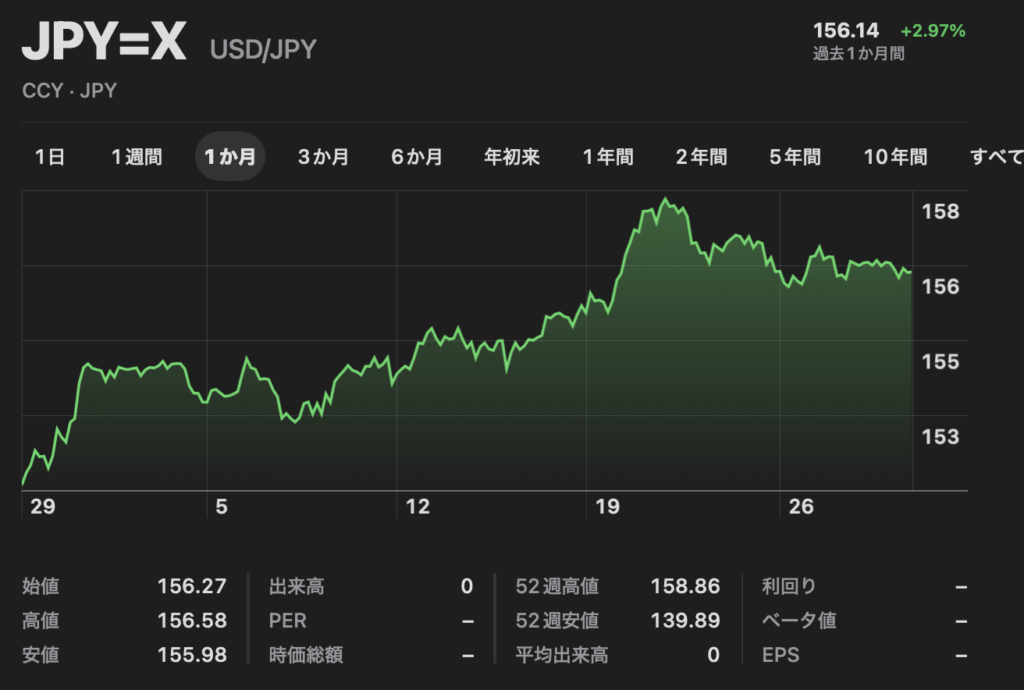 至近、1ドル156円まで円安が進んでいます。日米の金利差が埋まる可能性が低く、このまま155円前後を行き来するのではないでしょうか。