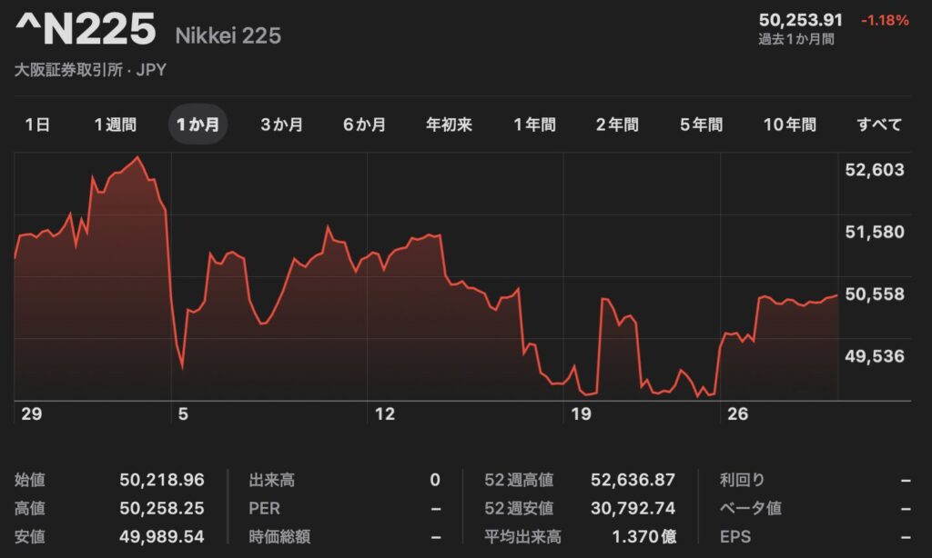日経平均は、AI関連銘柄に引っ張られる形で、相場が荒れていますが、直近5万円台を回復しています。