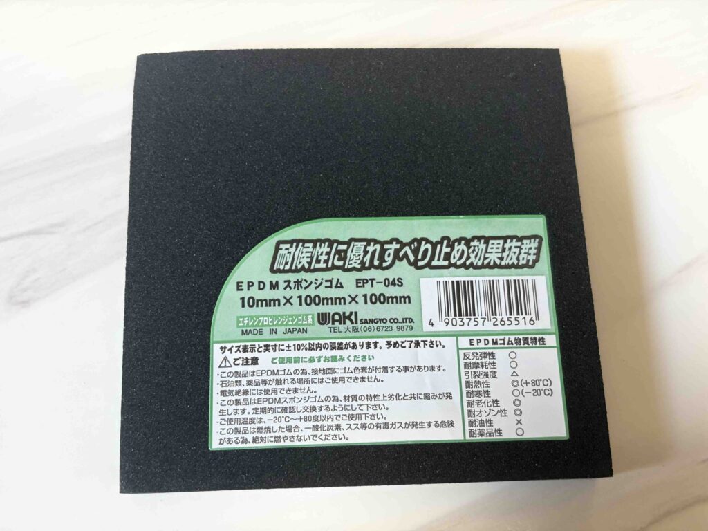 そんなわけで、対策として買ってきたのがこちらのスポンジゴムです。ホームセンターで、200円ほどでした。購入のアドバイスとしては、耐熱性、耐寒性に着目しましょう。